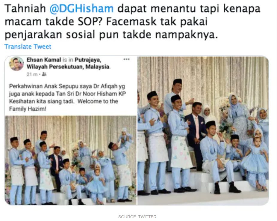 On March 21, 2021, photographs of Noor Hisham were circulated online showing him breaking his own standard operating procedures (SOPS) during the MCO. These photos showed Noor Hisham at a party with other family members standing closely together without masks at a wedding reception for his daughter Khairin Afiqah.