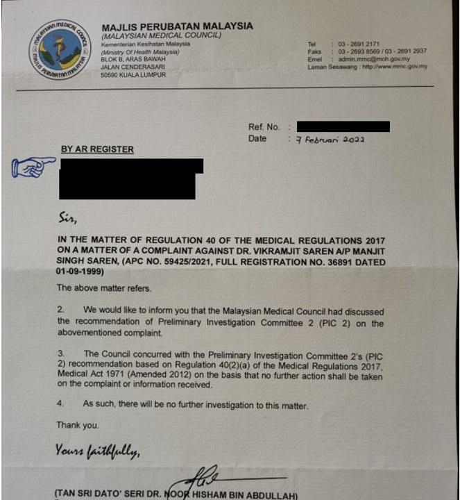 Complaints are just being white washed through a single letter, stating ‘there will be no further investigation into the matter’. The dismissive reply in the case shown above is from the same disciplinary investigation committee, PIC II, headed by Megat Burhainuddin in which he, as the chairman, was heard in an audio recording refusing the proper investigation of an accused doctor on a ‘no questions asked’ basis and in which the legal advisor was recorded as saying they would ‘get this thing done sneakily’ referring to the subsequent dismissal of the charges against the same doctor.