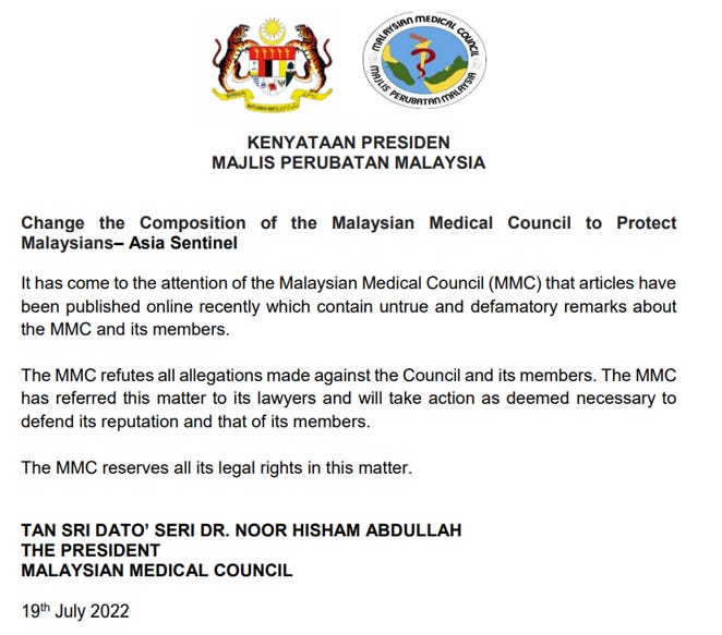 Finally, too many Malaysians have suffered from mal-practice and botched medical procedures. The MMC has been covering up and protecting their own. As president of the MMC, Noor Hisham threatened those who exposed these issues with legal action, rather than remedying the real problems.