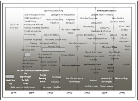 The first part of the 20th Century was chaotic for growth and development due to protectionism and national self interest. There were two world wars within a space of less than thirty years. Britain was still a colonial power; Japan was rapidly becoming the power of the East, South-East Asia still underdeveloped and entrepreneurship in America stifled by Roosevelt’s quasi-socialist new deal programs.8 Although the Second World War had a positive influence on new technology development, it was only in the post war years that entrepreneurs began to reemerge in perhaps the fastest thirty years of growth the world had ever experienced. A barrage of new industries based upon newly developed technologies was created and grew, rapidly changing society.