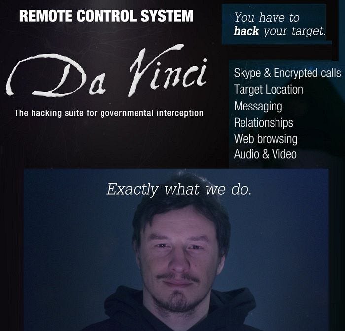 'Hack into your target with the most advanced infection vectors available. Enter his wireless network and tackle tactical operations with ad-hoc equipment designed to operate while on the move....Remote Control System: the hacking suite for governmental interception. Right at your fingertips.'