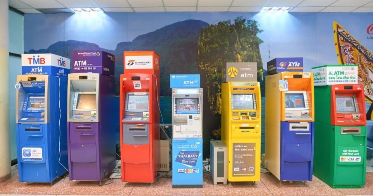Thai bank computer systems are centralized, yet Thai banks, unlike most other banks within the region still charge for paying in money to accounts held at the bank at different branches. They are treated as bank transfers where fees start at 30 Bht, and then run up to over 1,000 Bht on amounts above 100,000 Bht at some banks. Thai banks usually charge between 15-30 Bht for ATM withdrawals across their defined banking districts. This charge is in addition to the ATM service charge, which ranges from 10-25 Bht per transaction.