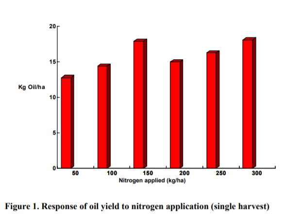 Replicated field experiments varying the application of nitrogen were undertaken to examine the effect on both the yield and oil composition. The yield and levels of the major constituents of kesom oil responded positively to nitrogen application. Figure 1 indicates the response of yield to nitrogen application.