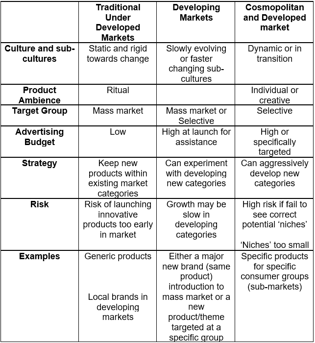 Globalism is bringing new ideas to different cultures around the world. Cultures vary in the resistance they have to new ideas. Values and beliefs also differ among age, social, religious, ethnic and socio-economic groupings (sub-cultures) within a market. Acceptance by a target group will depend upon how far away the product/theme is from the group’s traditional ideas and values.