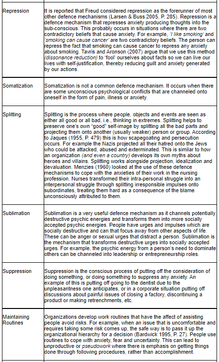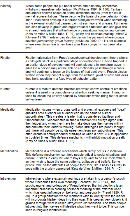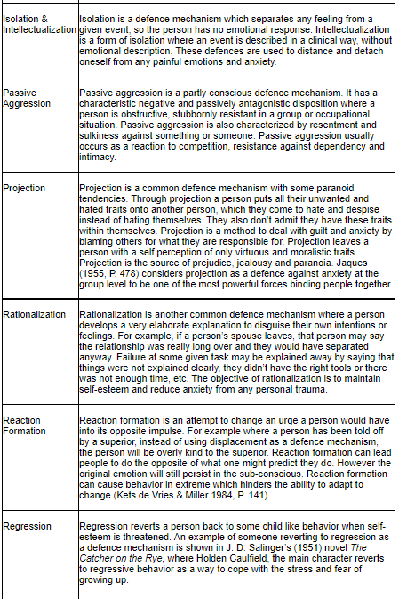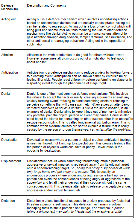 There are numerous more defences that the psych develops against anxiety (A. Freud 1936). Some of the major ones mentioned above are listed in the table below.
