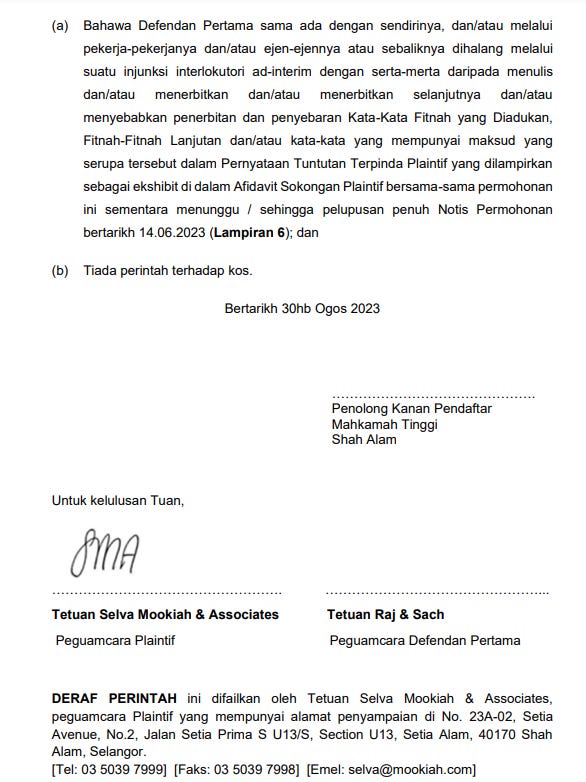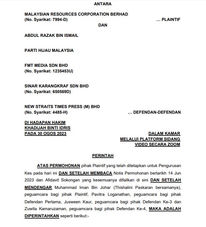 The plaintiff (MRCB, a partner with the Selangor State government in the Selangor Stadium project) gained an interim injunction against a politician/activist Abdul Razak bin Ismail. FMT Media, Sinar Karangkirak and the New Straits Times Press to stop posting and/or publishing and post or media in relation to the Selangor Stadium issue. This means that Abdul Razak cannot talk about the Stadium issue in the Pulai Parliamentary seat, and Simpang Jeram state seat, where he is campaigning.