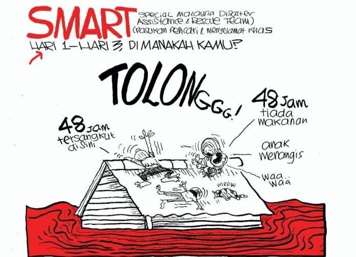 Likewise, the government has been very slow to respond to emergencies. People have been stranded on the tops of their homes, The Welfare Department (JKM) is making excuses that its role is limited to creating temporary relief centers, and not providing food to people stranded in their homes. There are already claims of corruption that politicians are benefitting in catering operations to feed people evacuated in some areas.