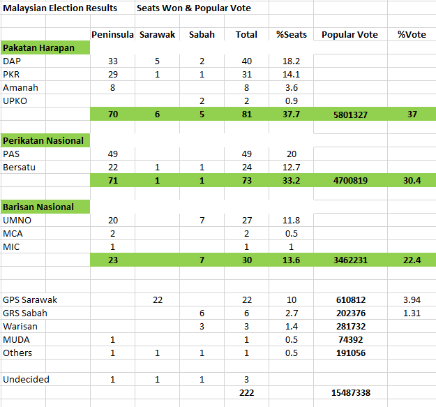 While two groups are vying to become the government, here are the statistics showing the popular vote and percentage of seats won. This puts a perspective on which party or group could claim to have a peoples’ mandate to govern.