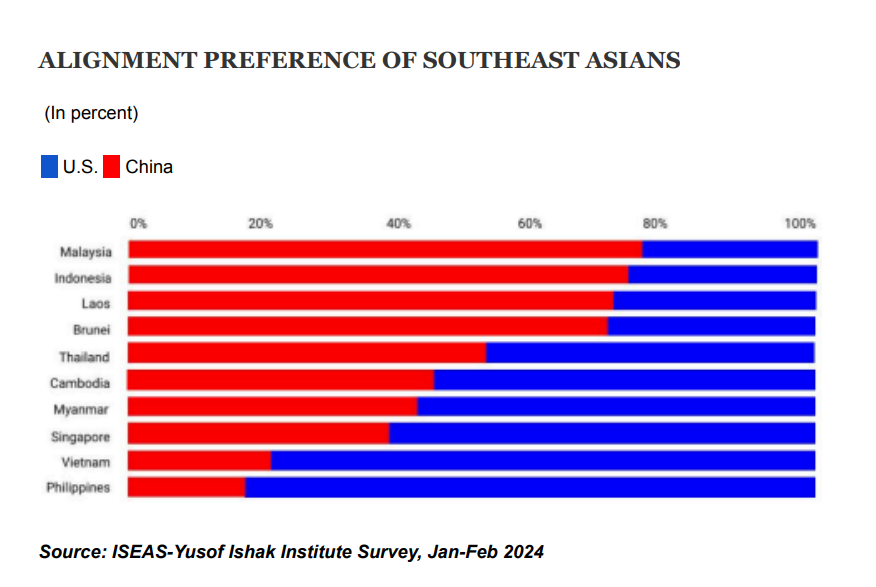 With regard to China which the Biden administration assessed as America's greatest geopolitical and geoeconomic rival, a recent survey of the ISEAS-Yusof Ishak Institute found that over half of Southeast Asians preferred alignment with China over the US. Its polling sample included respondents from the public and private sector, and researchers and academics who are in a position to influence policy.