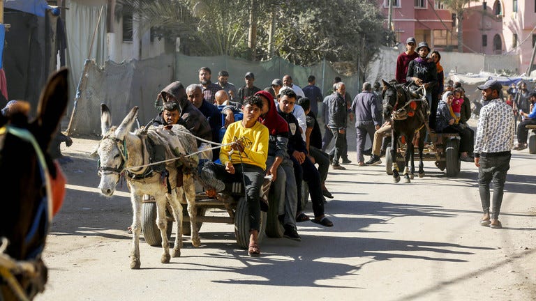 Palestinians travel with carts pulled by horses and donkeys as Israel continues to the entry of fuel amid the continuation of the Israeli army's attack on Deir Al Balah, Gaza on November 20, 2024. © Ashraf Amra/Getty Image