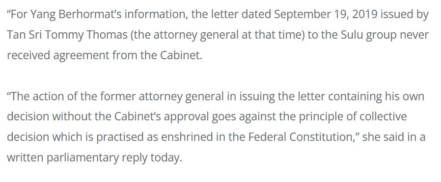 “For Yang Berhormat’s information, the letter dated September 19, 2019 issued by Tan Sri Tommy Thomas (the attorney general at that time) to the Sulu group never received agreement from the Cabinet.’