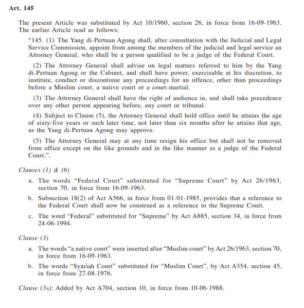 Section 3 of Article 145 of the Malaysian Constitution states: “(3) The Attorney General shall have power, exercisable at his discretion, to institute, conduct or discontinue any proceedings for an offence”.