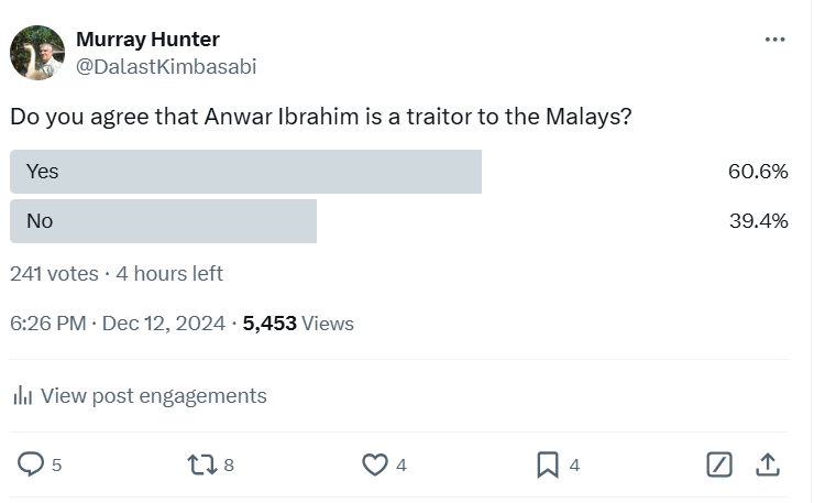 In a quick X poll taken for 18 hours from last night, respondents were asked “Do you agree that Anwar Ibrahim is a traitor to the Malays?” Out of 5,431 views and 238 votes 60.6% agreed and 39.4% disagreed.