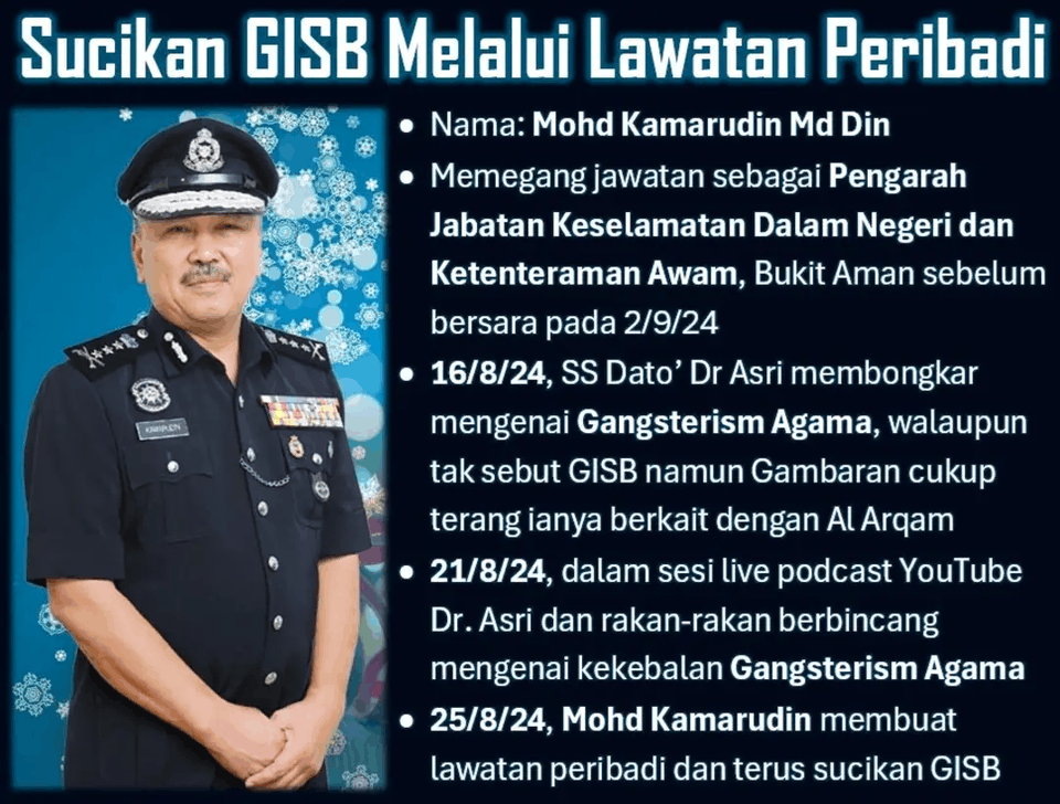 On August 25, after the Perlis Mufti alerted the public to what’s going on at GISBH, a former high ranking PDRM officer Mohd Kamarudin MD Din (Director of security and public order) made a visit to GISBH in Rawang. This was called a private visit. When asked about the various allegation against GISBH, Kamarudin said he knows GISBH very well, and there are no violations of law.