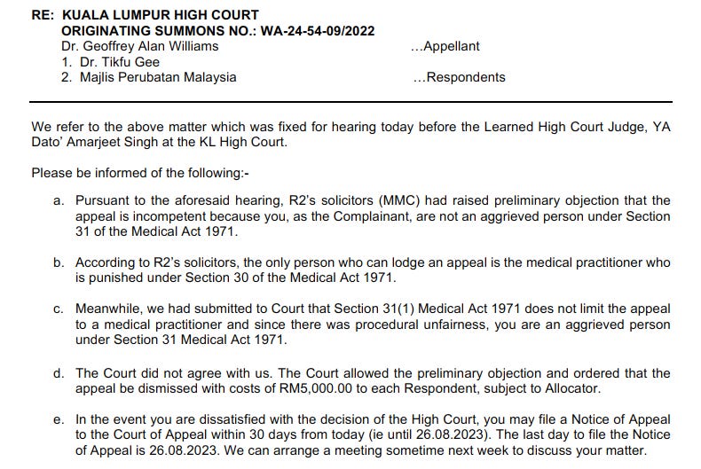 Judge Amarjeet Singh agreed with the MMC that the High Court didn’t have jurisdiction to hear the case, because Section 31 of the Medical Act 1971 is over-ridden by section 30 before it.