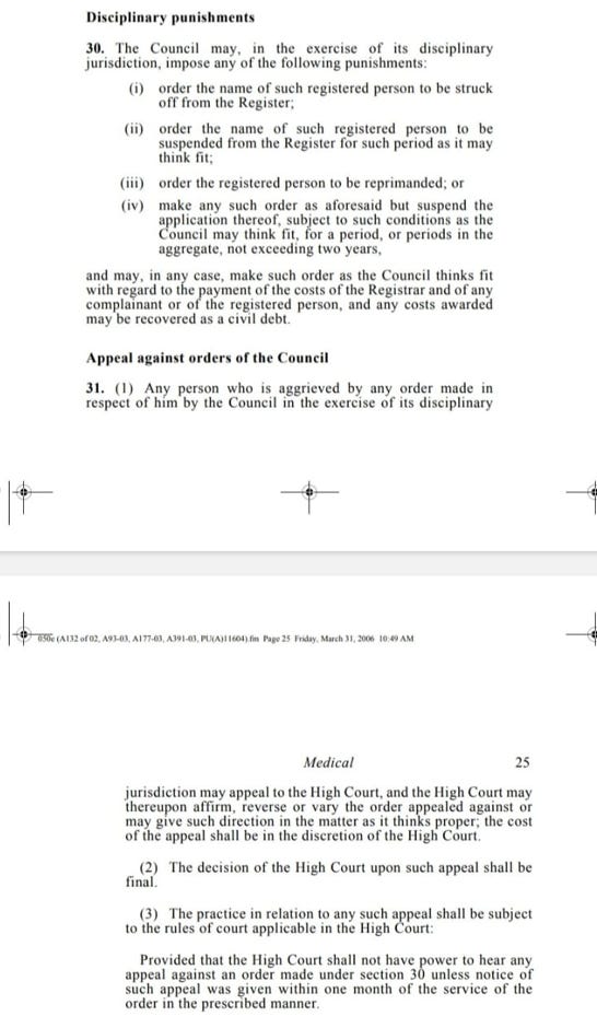 Section 31 (1) clearly states that “Any person who is aggrieved by any order made in respect of him by the Council (MMC) in the exercise of its disciplinary jurisdiction may appeal to the High Court, and the High Court may thereupon affirm, reverse or vary the order appealed against or may give such direction in the matter as it thinks proper; the cost of the appeal shall be in the discretion of the High Court”.