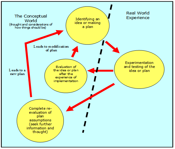 Finally society must have assumptions about how to adapt to the outside environment and how to achieve its goals. From the individual point of view, assumptions that enable one to function coherently within a group must be discovered. This is a process of using assumptions and testing their validity within a group. When feedback is positive, assumptions are validated. When feedback is negative, inappropriate assumptions will be discarded and new assumptions adopted and tested, until a working set of assumptions exists. This is a learning process shown in Figure 4.