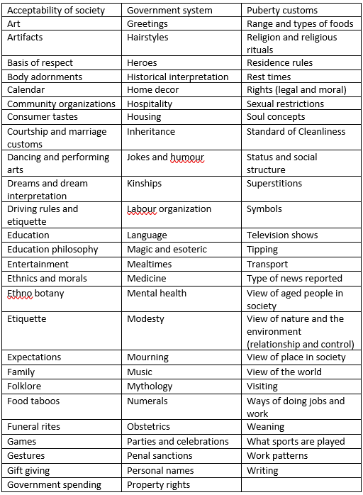 Basically culture will influence every aspect of life and how things are done. Some examples of areas of everyday life that is affected by culture are listed in table 5. below.