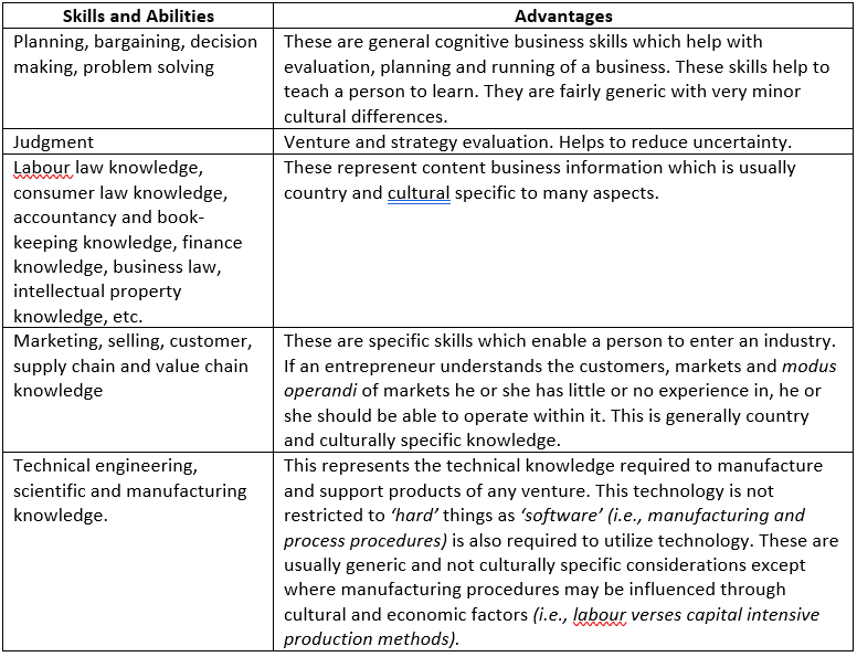 Education is experience and this can be obtained in alternative and informal ways like selling lemonade outside the family home during youth, or undertaking some sort of business activities while at school, etc. Doing small things in youth that are entrepreneurial and fun is a learning experience which can lead to bigger things as Michael Dell, as founder of Dell computers testified to in his semi-autobiographical book (Dell and Fredman 1999). Although it is not certain what effect education has on a person’s ability to discover and construct opportunity. Table 4. below lists the advantages education provides people in this regard.