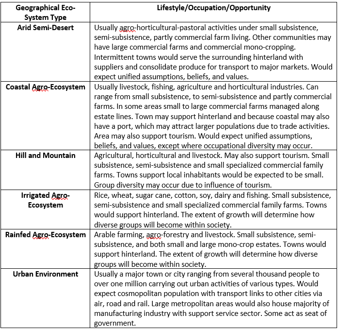 How communities react to economic development through tourism, industrialization, increases in trade through their region is very complex, with research providing different conclusions. One can see that communities with a long history of exposure to outsiders appear to be tolerant and appreciative of the opportunities this brings. Conversely, communities with little exposure to outsiders appear to be less open to new ideas and change[1]. Table 3. shows the different influences geographical features could have on lifestyle, occupations and opportunities.