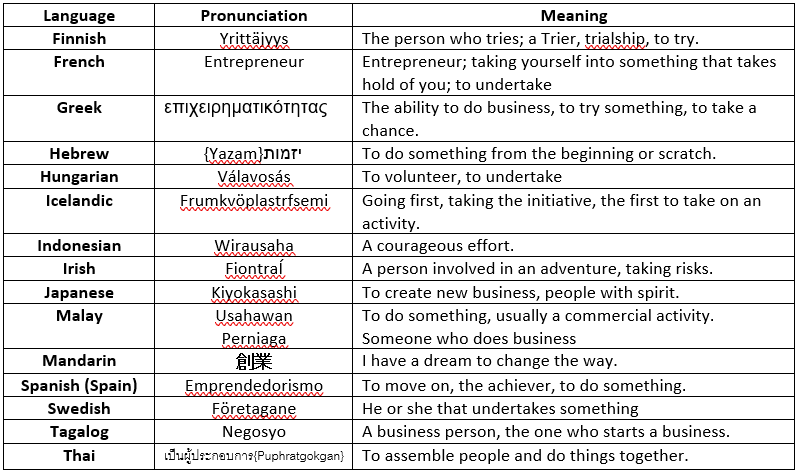 Language can be seen as the pride of a culture. Many countries still use their respective national languages as the official language and language of education. Language includes not only written and spoken words, but expressions which have specific cultural contexts and meaning, signs, symbols, gestures, mannerisms and pauses. Words although translated similarly, may in actual fact have wider or narrower meanings, which can change its emphasis and connotation. Language is embedded into custom and manners where it becomes the narrative of meaning for people. Table 3.6. below explains the meaning of the word “entrepreneurship” in a number of languages and shows some differences in cultural contexts[10].