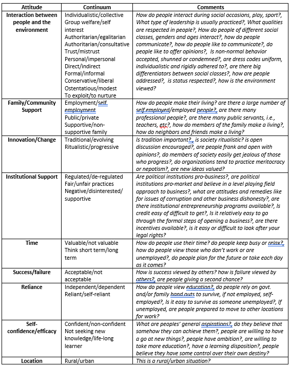 The key is to look at what values in a culture support entrepreneurship and innovation and what don’t. Values that support a strong work ethic, individual accountability, and a sense of independence are required. Fatalism can destroy any sense of self-efficacy on the part of an individual. Cultural values that are most supportive will be those that support optimism and improvement of one’s own situation. A culture should support cooperation and the concept that cooperative effort pays off. This will be an important determinant of growth. Societies that believe in a ‘fixed pie’ approach to competition will find it very difficult to cooperate with others, as all are competing for a piece of it without considering the possibilities of change and growth. Cultures that support experimentation will provide a better platform for innovation than those which discourage it. Fundamental, collective, and heavily censored societies tend to stifle innovation. It is not necessarily a need for a democracy but an allowance for its citizens to undertake novelty. Finally it is a matter of how a society looks at time, do they live for today? Are they mired in past traditions? Or look optimistically to the future?