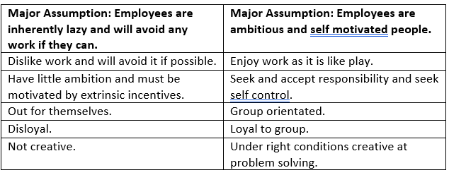All management theory is built upon assumptions of the nature of human nature. Very early on in the emergence of modern management Frederick Taylor developed a philosophy called scientific management that assumed that man could not be trusted and had to be controlled. Decades went by until this was disproven through The Hawthorne Experiments carried on by Elton Mayo which lead to a new set of assumptions that man was a being that wanted social interaction and could be motivated through intrinsic means. A clear expression of the two polarized assumptions of the nature of human nature can be seen in McGregor’s (1960) Theory X and theory Y. Theory X and Y are two sets of broad assumptions where Theory X sees man as basically untrustworthy, needing to be closely supervised and extrinsically motivated and Theory Y, which sees man as trustworthy, not needing to be closely supervised and intrinsically motivated. Some of the major characteristics of Theory X and Y are shown in Table 5.