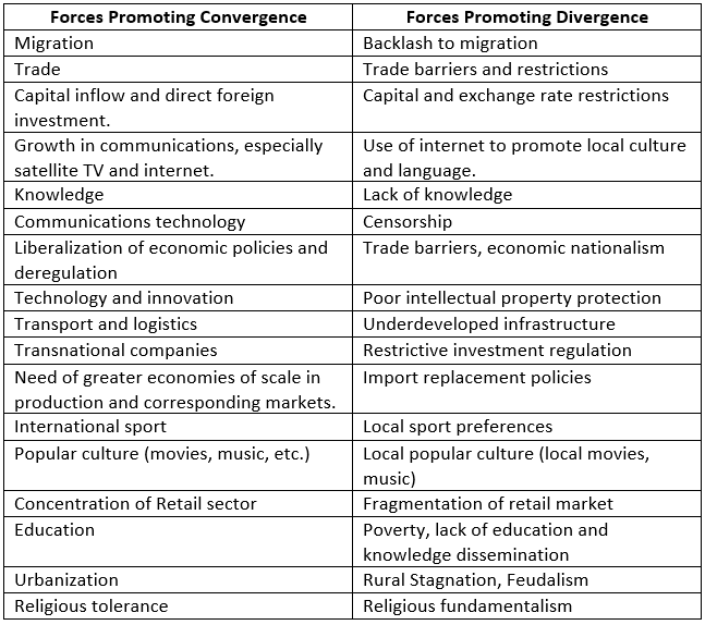 However, within a country there are forces that counter or block the impacts of global influences, just as there are also forces that promote the acceptance of global influences. Thomas Friedman (2005) believes that there are two aspects of culture that determine convergence or divergence in a country: how outward is the culture (or how inward)? And how open is it to new ideas? Friedman (2005 pp. 421-423) continues on to say that some cultures are more outward and open than others to foreign influence, contrasting the differences between the more moderate Islamic countries like Turkey, Lebanon, Bahrain, Indonesia, Dubai and Malaysia to the more fundamental Islamic nations. Some of the forces for convergence and divergence are listed in Table 2. below.