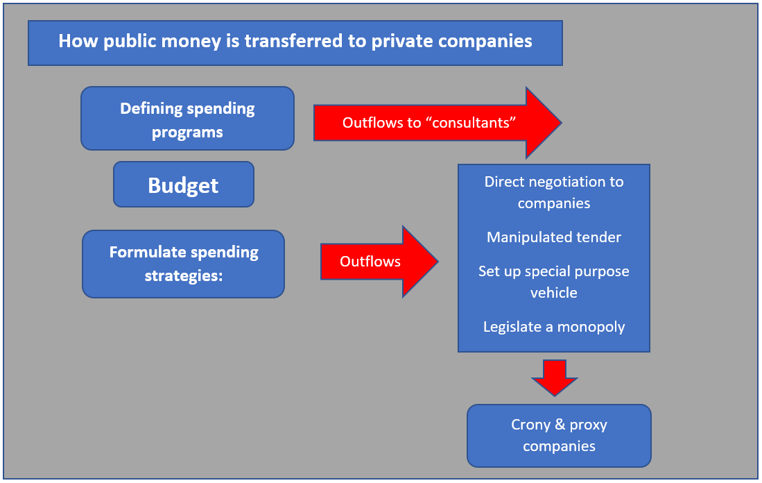 Therefore, political leaders and their staff must rely upon the civil servants within the ministries to direct funds into selected contracts. Through selective special purpose ventures, operated either by cronies or proxies are the beneficiaries of these funds. Getting things done, requires collaboration between people within the political and administrative arms of government.