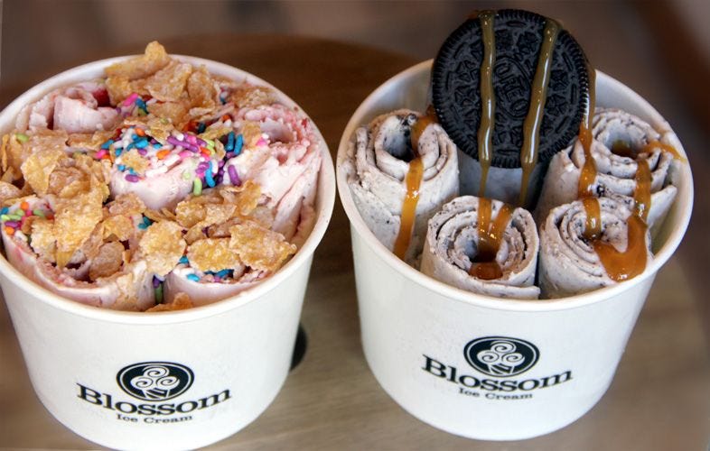 The idea for today is made to order rolled ice cream. Imagine a hot day out and about town and you suddenly feel like a delightful fruity, fresh and creamy ice cream. Rolled ice cream is the answer.