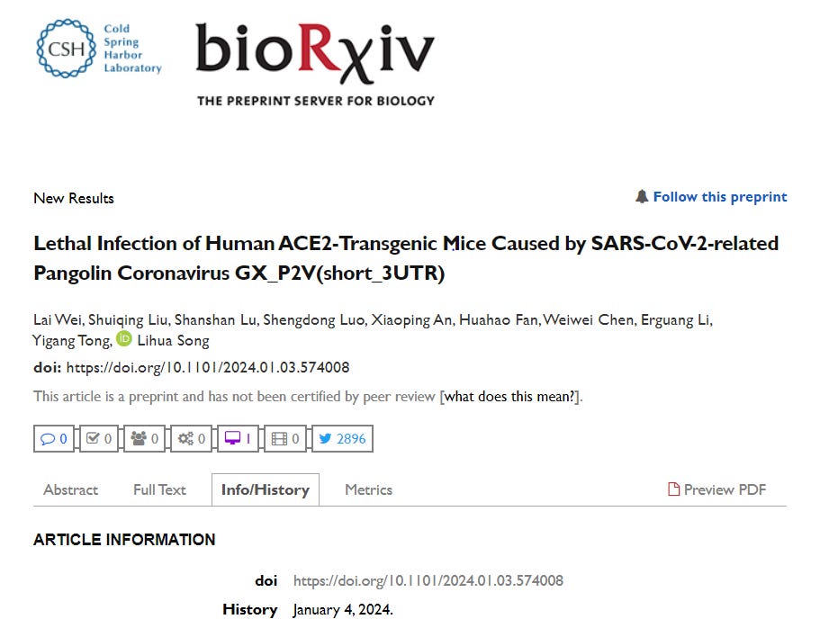 A preprint just released on bioRxiv, Lethal Infection of Human ACE2-Transgenic Mice Caused by SARS-CoV-2-related Pangolin Coronavirus GX_P2V(short_3UTR) reports a group of scientists connected with the PLA have through gain of function research developed a highly lethal novel corona virus, that lead to the death of 8 humanized mice through brain infection.