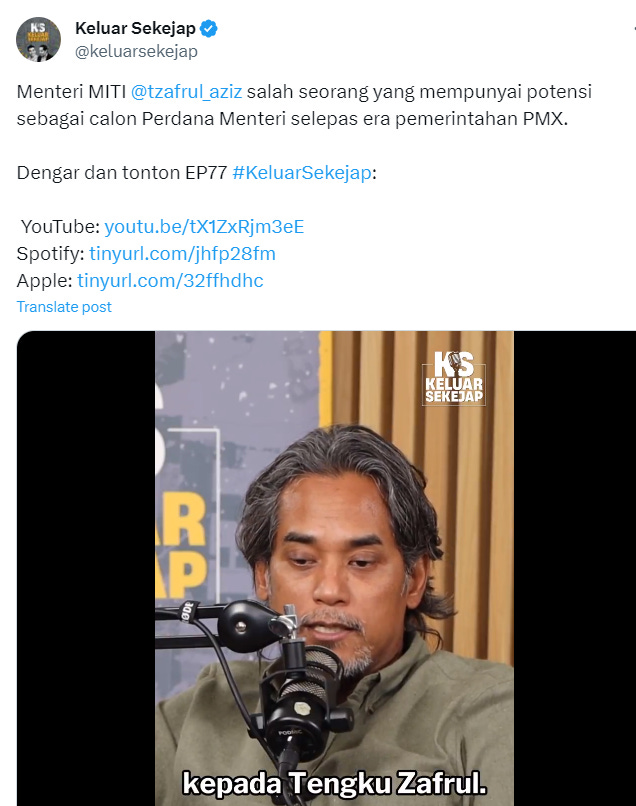 Another WEF stalwart Khairy Jamaluddin, who is also considered to be future PM material for the WEF, is using his radio program Keluar Sekejap to put Tengku Zafrul’s name out there and pitch for him.