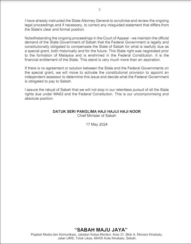 Press Statement by DATUK SERI PANGLIMA HAJI HAJIJI HAJI NOOR Chief Minister of Sabah