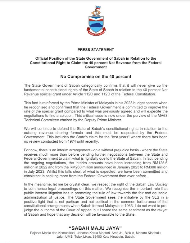 Official Position of the State Government of Sabah in Relation to the Constitutional Right to Claim the 40 percent Net Revenue from the Federal Government