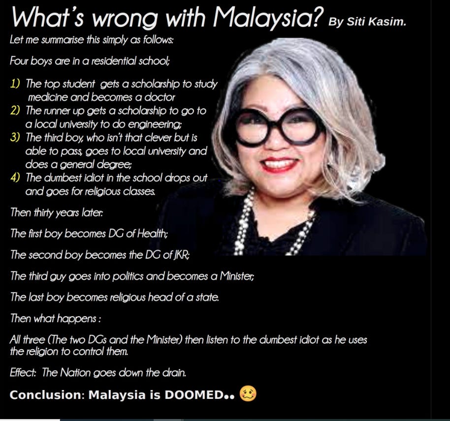It is diffficult to see how a rational mind could accept such tripe to which Siti Kassim, a legal practitioner could lend her name, and her persona to something as absurd as this footnote be taken seriously, her a summary of whats 'wrong with Malaysia' complete with 'bomb' attached.