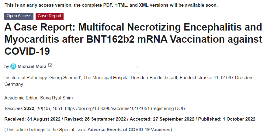 A new peer reviewed paper published in the journal “Vaccines” on October 1, titled A Case Report: Multifocal Necrotizing Encephalitis and Myocarditis after BNT162b2 mRNA Vaccination against COVID-19, provides some illuminating conclusions. The journal Vaccines is peer reviewed open-access journal, affiliated with the American Society for Virology.