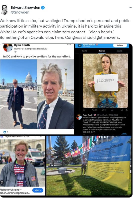”We know little so far, but with the alleged Trump shooter's personal and public participation in military activity in Ukraine, it is hard to imagine this White House's agencies can claim zero contact—’clean hands.’ Something of an Oswald vibe here. Congress should get answers,” Snowden wrote on X.