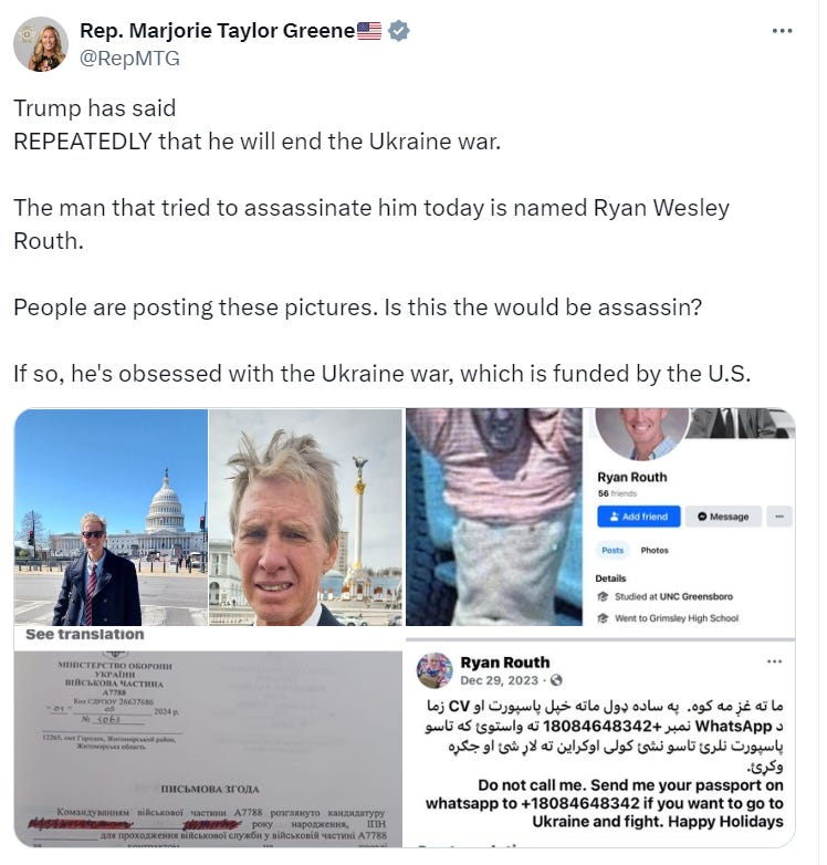 Republican Congresswoman Marjorie Taylor Greene stated that if the suspect’s identity is confirmed, it is clear he is “obsessed with the Ukraine war, which is funded by the US.”