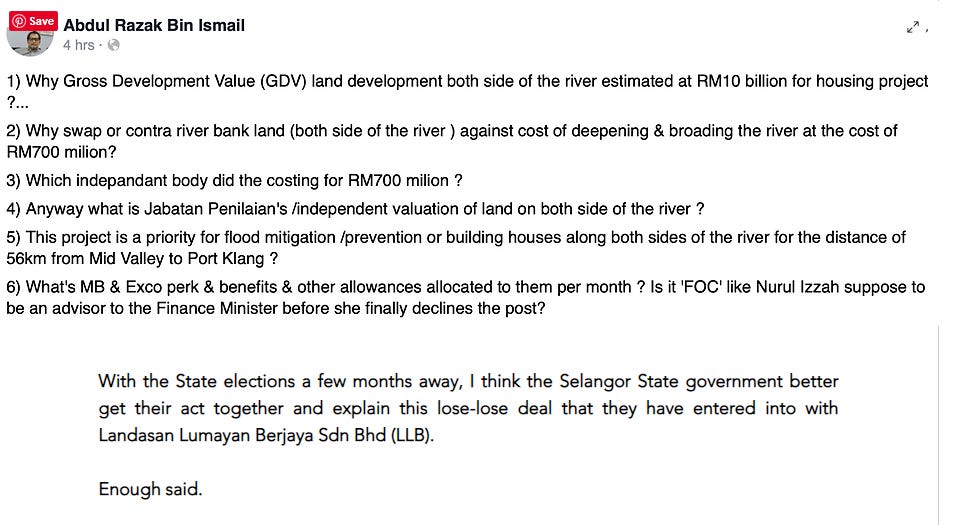 The commentor, Johan Taharin goes on to provide the link below to download the request for proposal - RFP No: LLSB/SMG/PD-RFP-S17/22-001 - entitled -PROPOSED JOINT DEVELOPMENT BASED ON A RIVER FRONTING CONCEPT ON APPROXIMATELY 14.794 ACRES OF LAND LOCATED AT SEKSYEN 17, SHAH ALAM, SELANGOR. Download of this RFP is password protected, though by its title, it does not appear to be about widening or deepening the river as part of flood mitigation, which is long overdue, given the flash flooding of places by the river, such as Taman Sri Muda and other farther down-river.