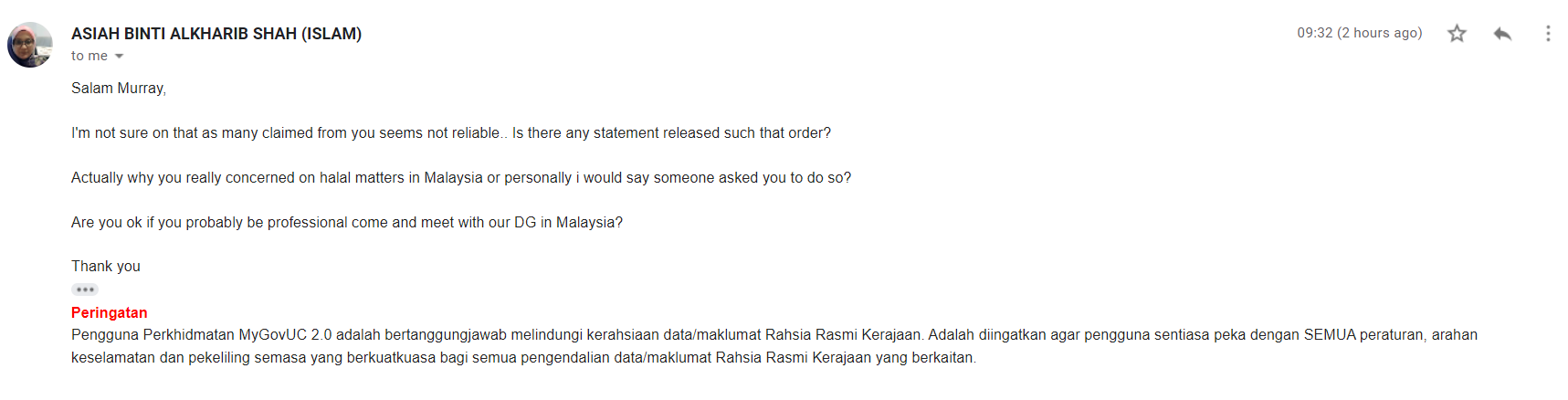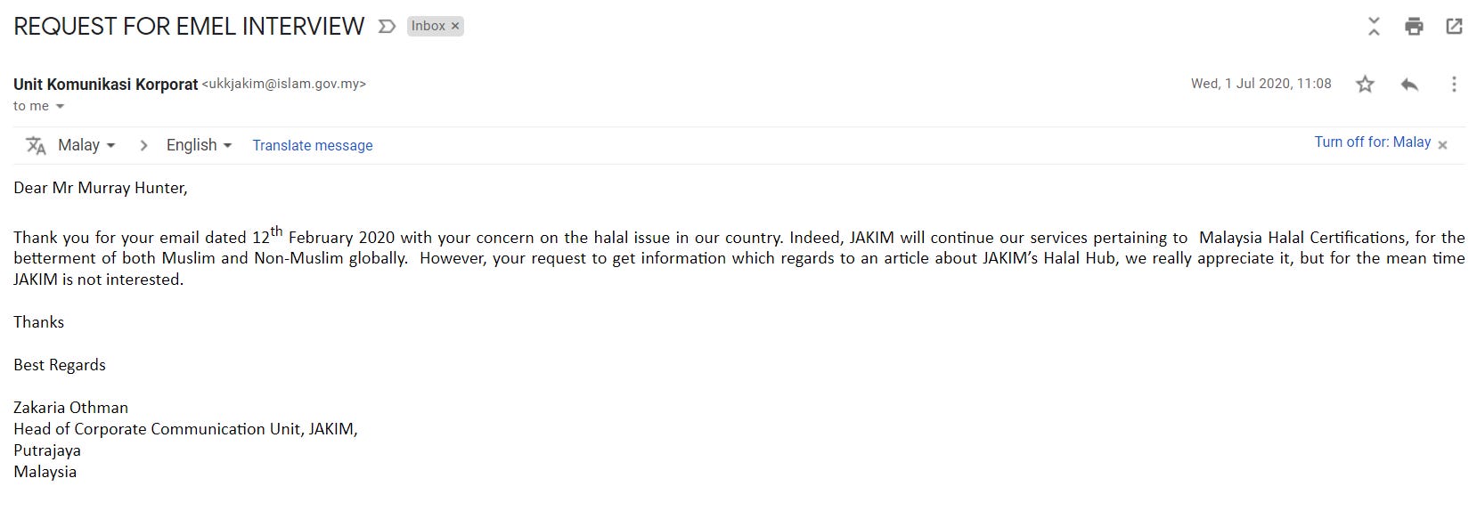 Asiah suggested the writer come to Malaysian and meet with the director general of JAKIM. The writer has on a number of occasions requested interviews with the JAKIM director general. Many requests, especially over the last two months were just ignored. Here is a sample of the reply received back in 2020.