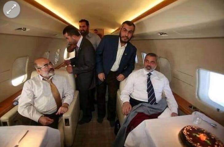 The "ostensible" leader of Hamas is one Ismail Haniyeh who is a very rich man. But he lives in a five star hotel in Qatar. Here he is (seated right) in a private jet.