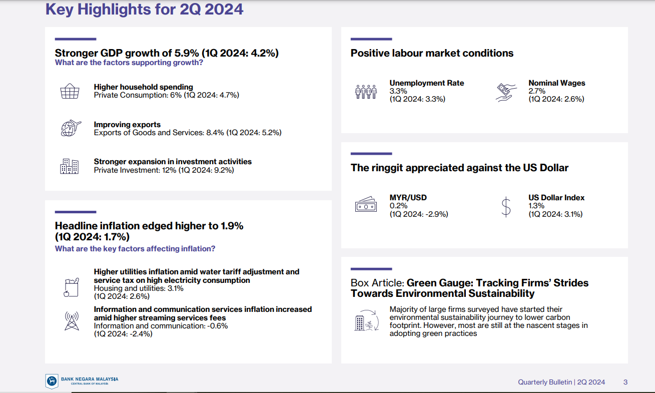 In an unexpected surprise for the Madani government, Bank Negara figures show a 5.9% growth in GDP for the 2nd quarter of 2024. This has been attributed to a growth in private consumption or household spending of 6.0%, a 12% growth in private domestic investment, and an 8.4% growth in exports.