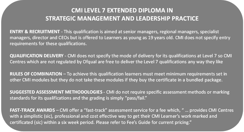 There are a number of oddities with CMI training models which render them unaccredited in countries outside the United Kingdom. An example is the widely available Ofqual accredited CMI level 7 extended diploma in strategic management and leadership practice.