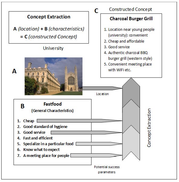 Concepts can be extracted and synergized from unrelated locations, objects and other business models. For example, a person may secure a particular rental location and wish to create some form of business model that would serve potential customers within that location. Potential young customers around the precinct of a university like to gather at near campus restaurants or coffee lounges for snacks and social gatherings. The general characteristics of a generic fast-food business is that it is cheap, has a good standard of hygiene, good service, fast and efficient, specializing in a particular food, people know what to expect and a meeting place for people. After study of the situation some of the characteristics of a generic fast-food business can be extracted according to what the potential entrepreneur feels are most important to the potential clientele of the potential location and a new concept constructed. A hypothetical result might be a charcoal BBQ Burger Grill which is conveniently located, cheap and