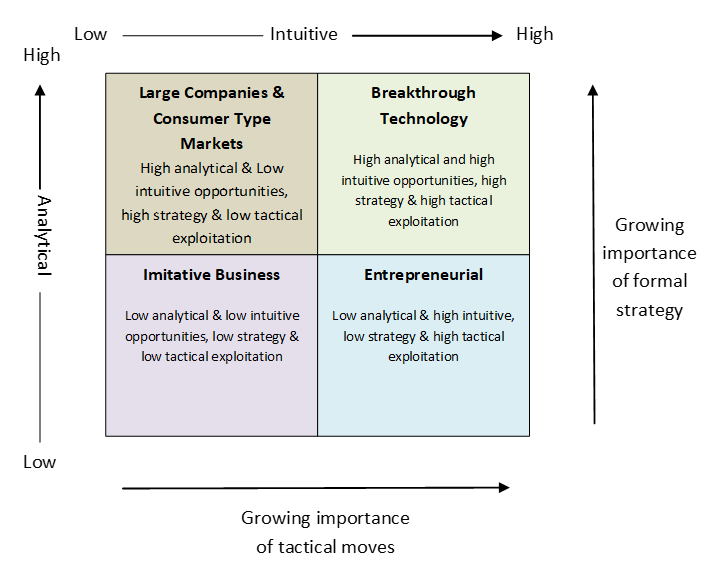 Opportunities that are based on the discovery of new markets due to changing industry structures or demographics for example, require high intuition to find them, using a low level of analysis. For example although a growing aged population can be observed very easy, new opportunities will tend to be intuitive rather than analytically based, i.e., this segment likes 50s classic music, so will new businesses based on this idea be successful? The answers can only be found out through trial and error. Entrepreneurs tend to carve out their product and market niches using tactical moves rather than utilizing formal strategy.