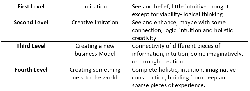 One would assume that the degree of mindfulness an individual possesses will also influence the depth of opportunity that can be observed within the environment. The table below shows the different depth of ideas that can be observed and associated forms of thinking involved in seeing and creating them.