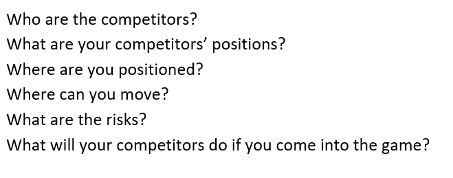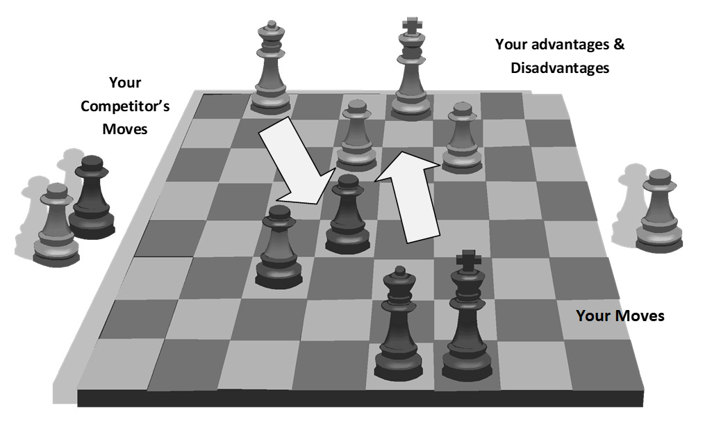 One way to mentally look at different scenarios is through what I call playing entrepreneurial chess. Entrepreneurial chess is just like playing a game of chess in the mind. There are pieces which represent yourself and different players on the board. The board represents the environment and market that you are operating within. During the game each piece has a different value, just like a chess game which is representative of your product, resources, capabilities, and networks compared to others, giving you specific advantages or disadvantages which play out on the board. Mentally you can imagine yourself on the chess field and ask yourself what will be the effect of your move?, what will the other players do?, etc. Just like a game of chess.