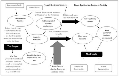In most cases it takes some form of shock event like a political upheaval or even revolution to change the situation where a more egalitarian business society is created where more liberal business environments exist.32 These reforms usually come under pressure by the people who have become educated, having the confidence to recognize opportunities and had the opportunity to travel and see other countries where the business environment is much more open. Once this change in society occurs the economy can move onto the next stage of becoming a developed economy. Figure 4 shows the transformation from a feudal to a more egalitarian business society.