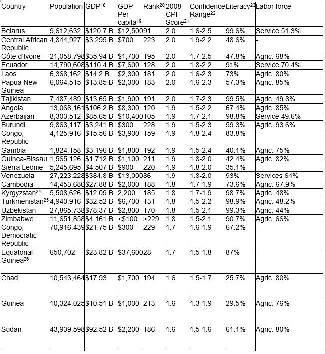Table 1 below shows some of the bottom level countries in the Transparency International Corrupt Perceptions Index16 with some additional economic statistics17 showing broad common characteristics of poor development and high perceived corruption.