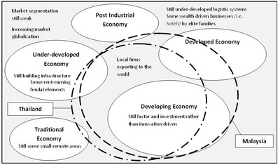 Figure 6 shows where both Thailand and Malaysia’s current development levels would be placed over the five stages of development. Both Thailand and Malaysia are predominantly developing countries relying on investment to drive their respective manufacturing sectors. However at the same time there are many aspects of both countries industries and markets that have the characteristics of a developed economy. Both Malaysia and Thailand’s services sectors are rapidly growing. Malaysia could also be said to display some characteristics of a post industrial society where some of the large government linked companies (GLCs) make substantially wealth based investments in real estate and construction projects rather than investments in innovation. Outside the major cities both Thailand and Malaysia are characteristic of under developed economies still using traditional techniques in local farming and fishery enterprises, still lacking basic infrastructure in some places. Paradoxically Thailand still has hill tribes around Chiang Rai that still maintain traditional lifestyles and Malaysia still has the Iban, Dayak, and Dusun tribes in Borneo.